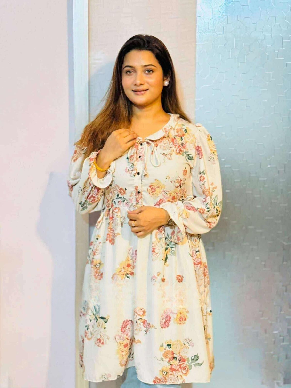 This long shirt-style top features a beautiful floral print on premium Alex Georgette fabric. Designed with button details at the neckline, a flattering flare of 85+, 36" length, and 20" sleeves, it offers both style and comfort. Available in multiple sizes, perfect for a vibrant and fashionable look.